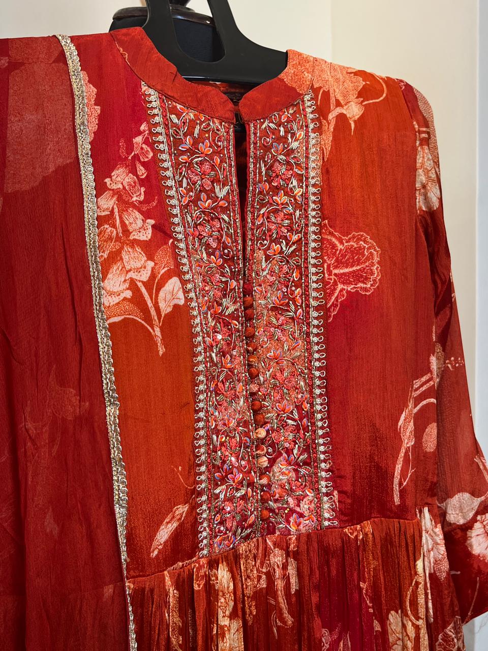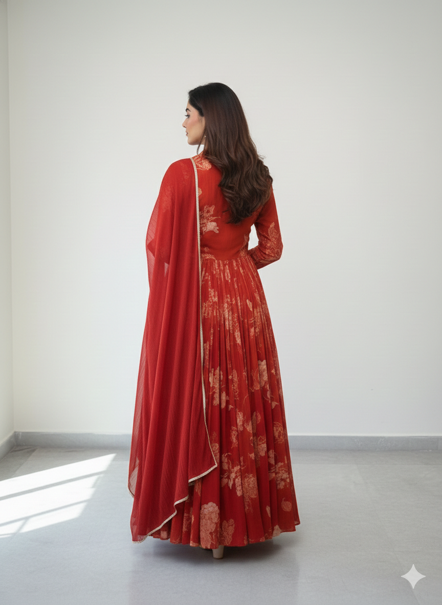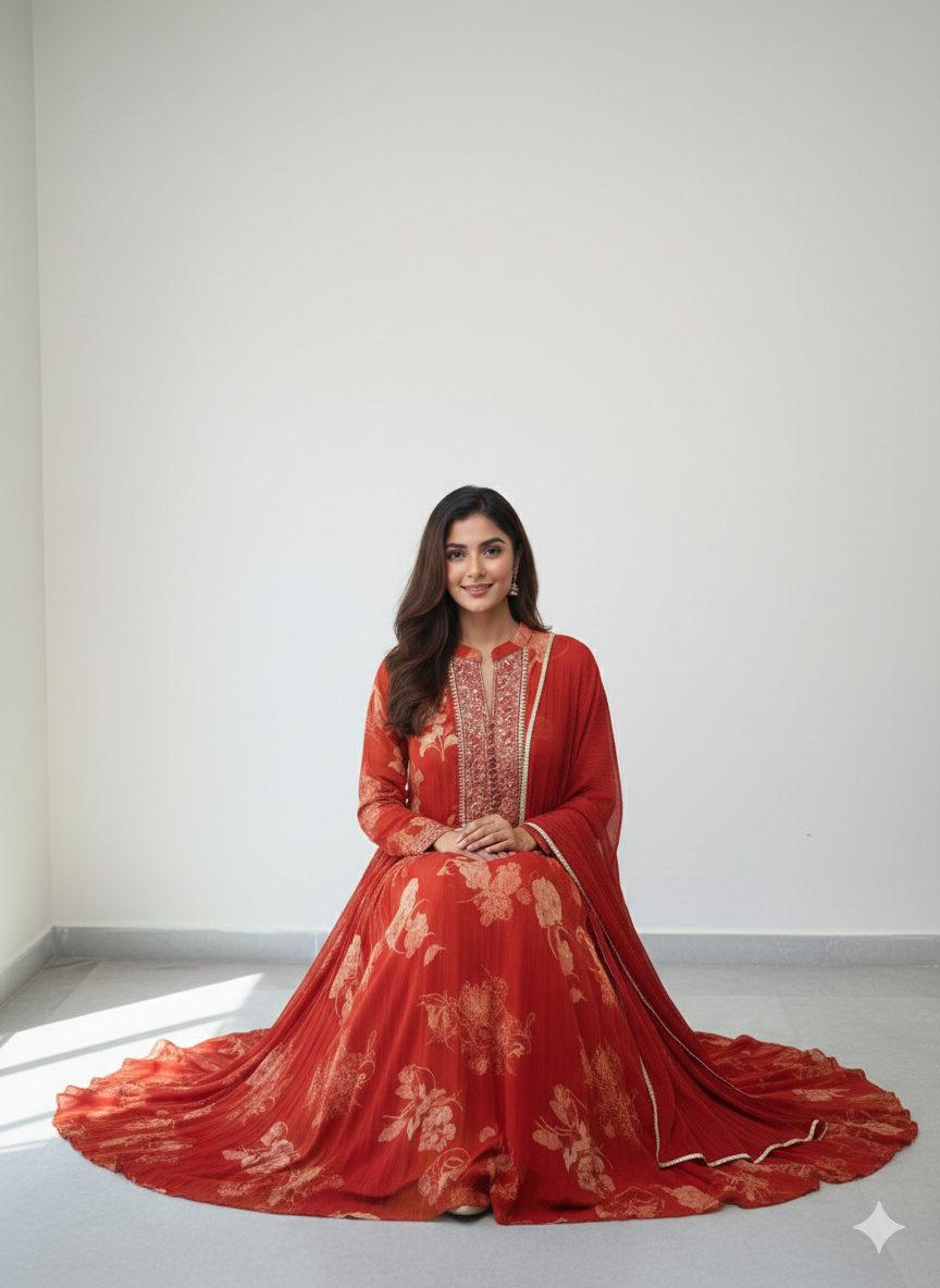 Grace meets charm in this stunning rust-toned gown, featuring intricate embroidery on the yoke and subtle floral prints all over. Crafted in soft, flowy fabric for effortless drape and comfort. Paired with a matching dupatta adorned with delicate lace edging, this ensemble is perfect for festive gatherings, family functions, or evening occasions.