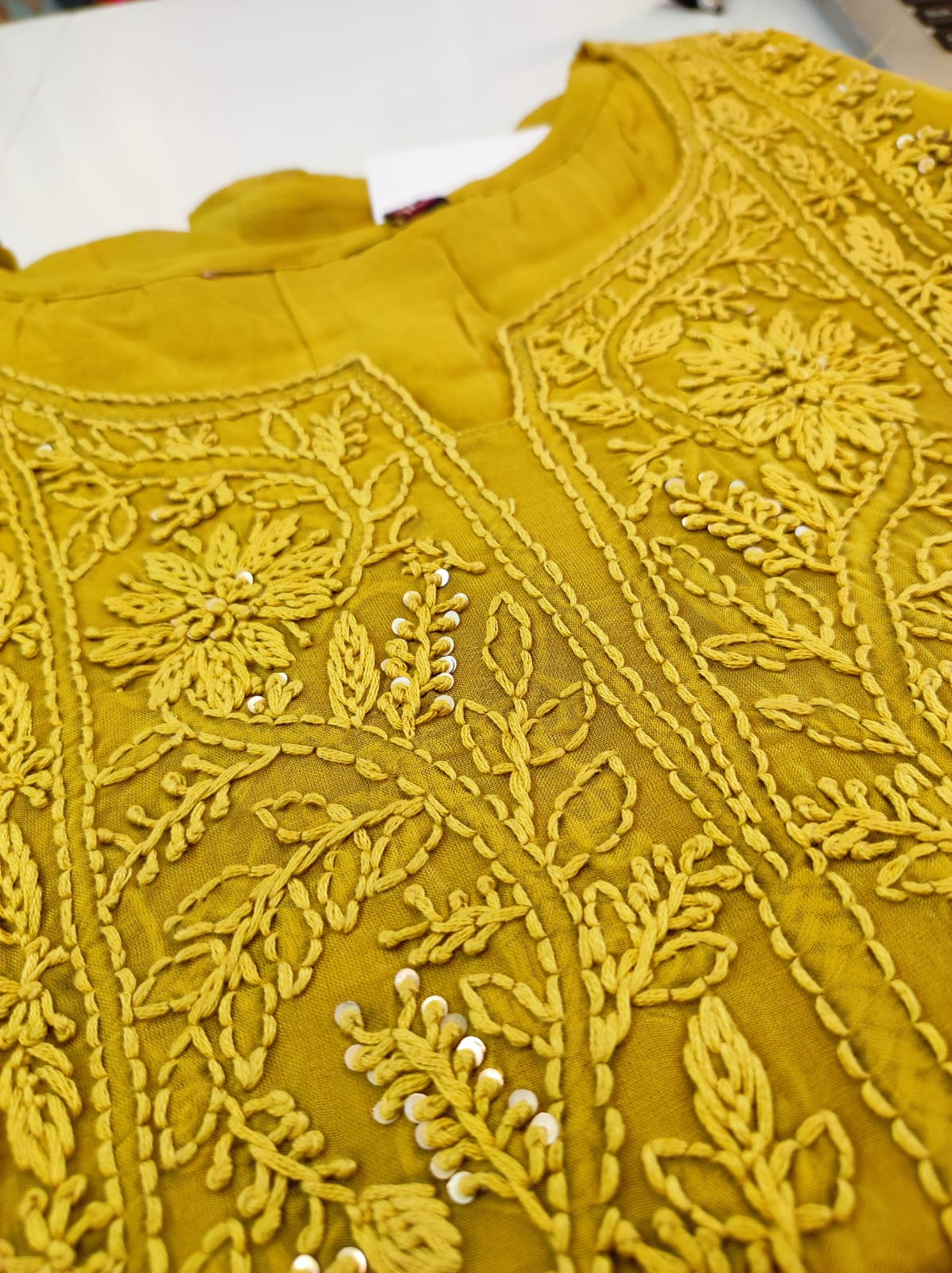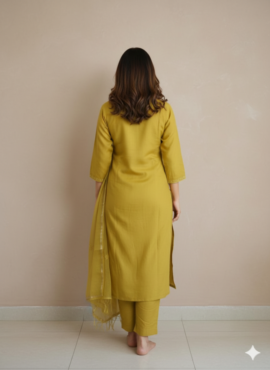Brighten up your festive wardrobe with this elegant mustard yellow three-piece set. ✨ Crafted with delicate thread embroidery on a soft, breathable fabric, the kurta features a classic notched neckline and full sleeves for a timeless ethnic look. Paired with straight-fit pants and a lightweight dupatta adorned with subtle floral motifs and a golden border, this outfit blends tradition with effortless style. Perfect for festive celebrations, family gatherings, or special occasions — a statement piece that radiates grace and charm.