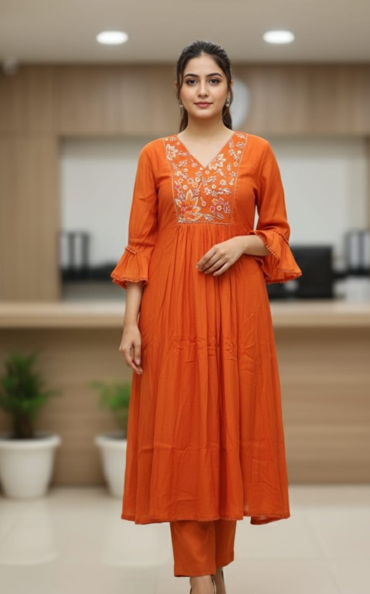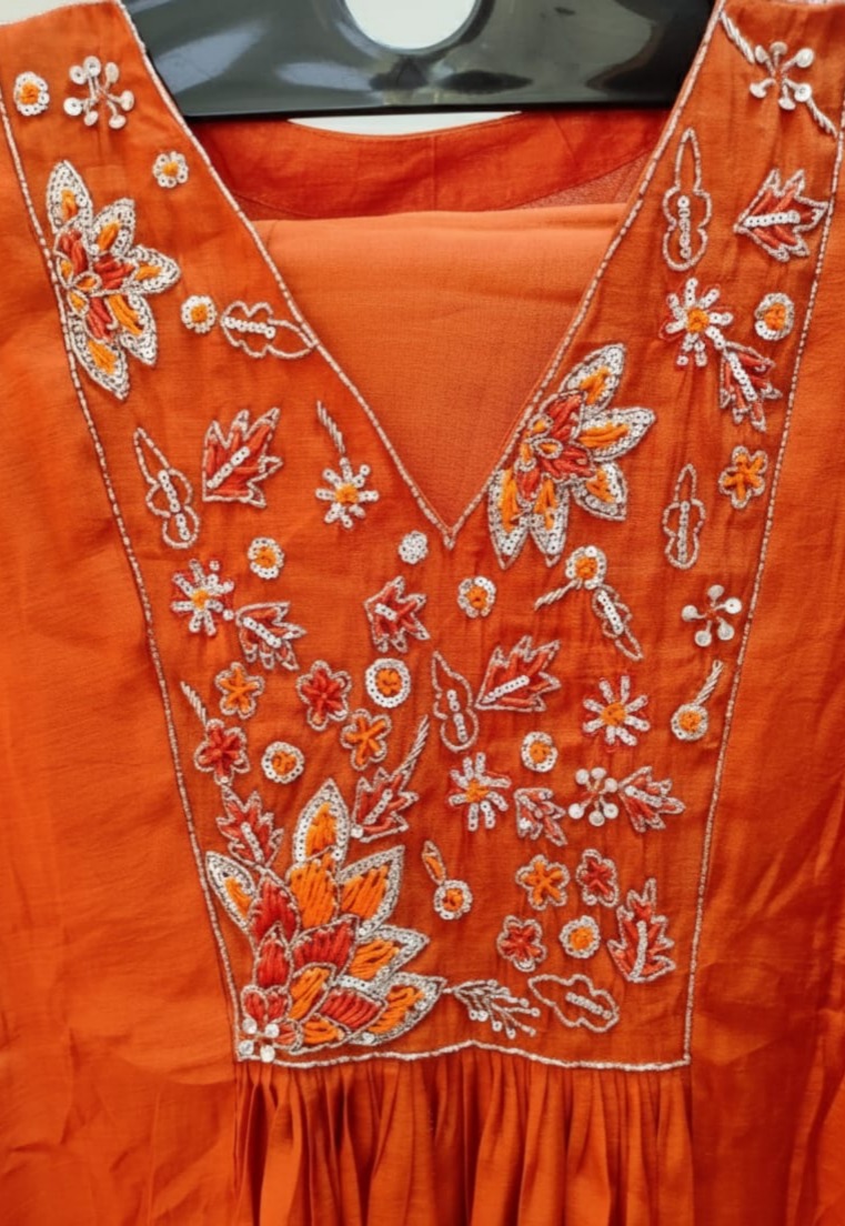 Radiate festive charm in this Orange Mul Chanderi Three Piece Set, beautifully adorned with delicate piping, sequence, thread, and lace work. The soft chanderi fabric offers a luxurious drape and subtle sheen, perfect for elegant celebrations. Paired with a matching dupatta and bottom, this ensemble blends traditional craftsmanship with modern grace.