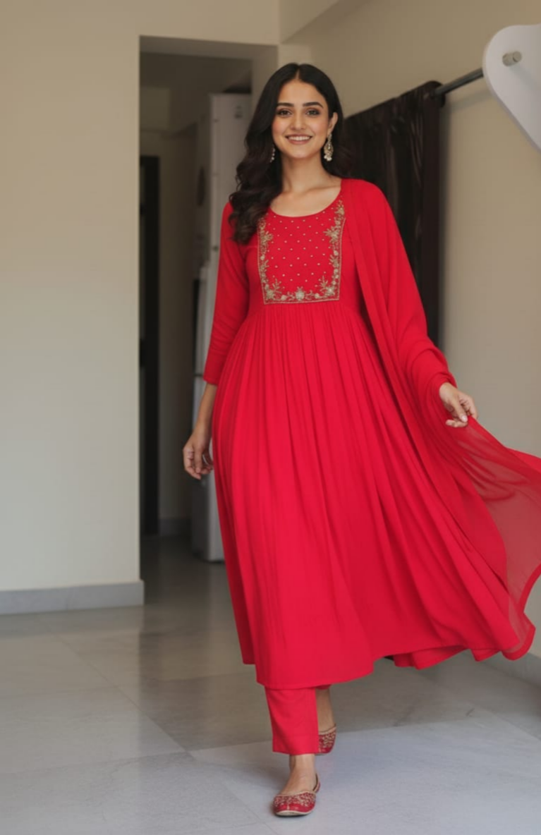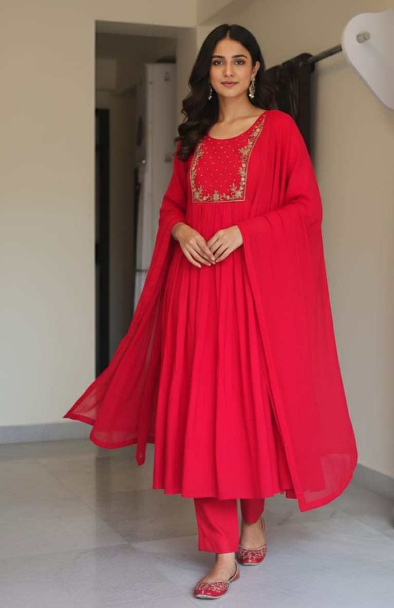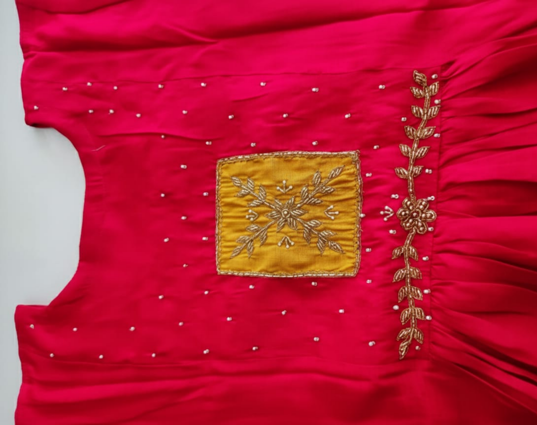 Elegant deep pink Chanderi silk three-piece set featuring intricate patch detailing in the back, delicate beads embellishments, and fine piping work. Perfect for festive and traditional occasions, this set combines rich texture with timeless charm for a graceful ethnic look.