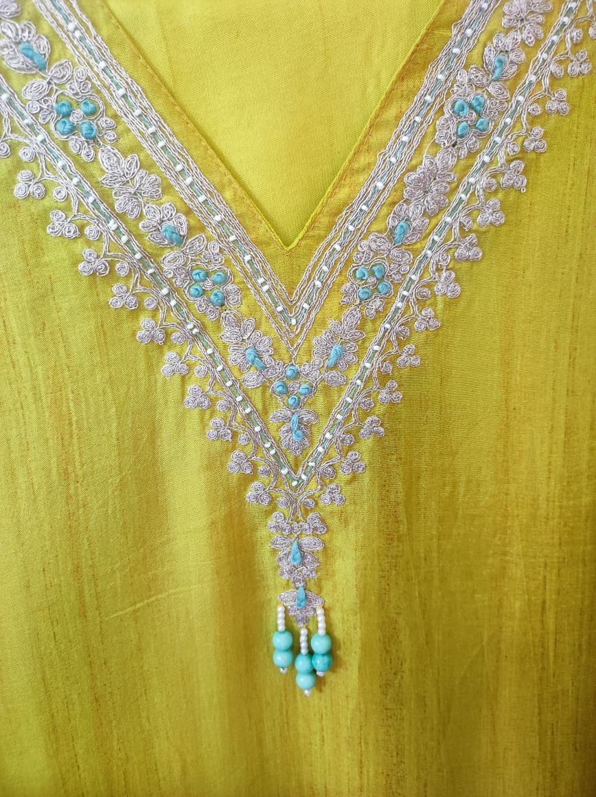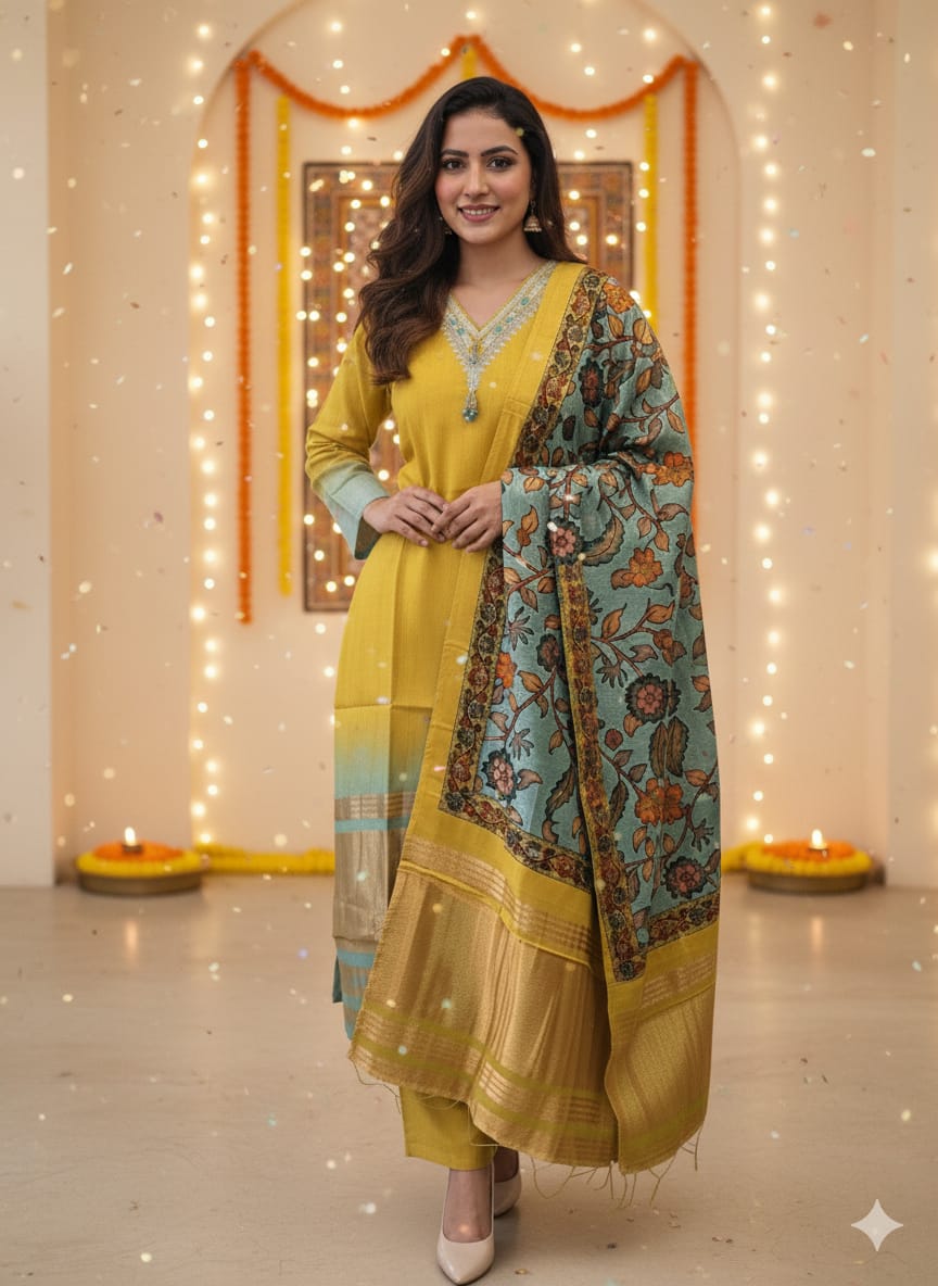Elegant Lemon Green Chanderi Silk three-piece set: A fresh lemon-green kurta made from luxurious Chanderi silk, paired with matching bottoms and a coordinating dupatta — lightweight, shimmering and perfect for festive or daytime occasions.