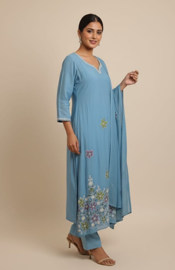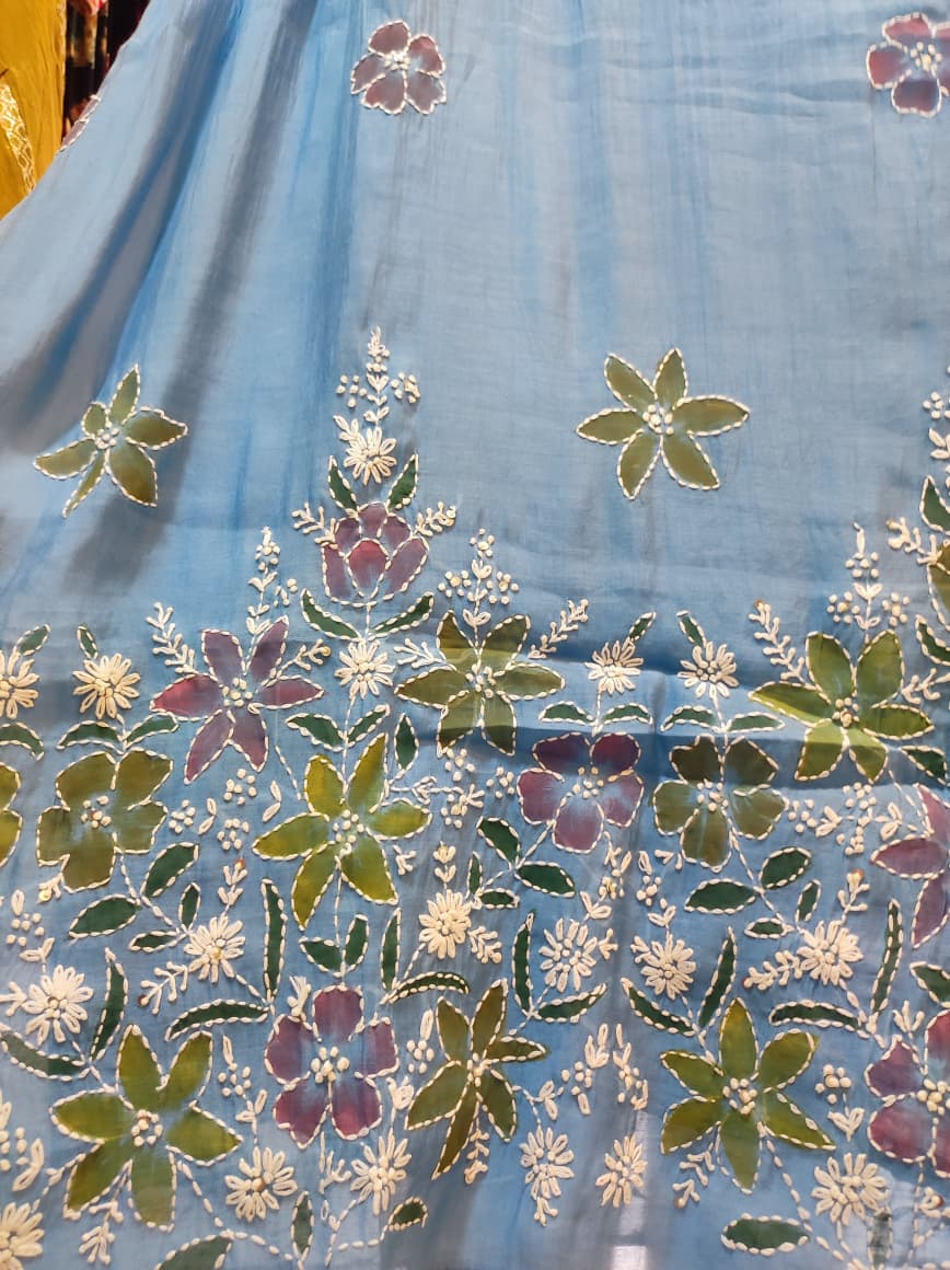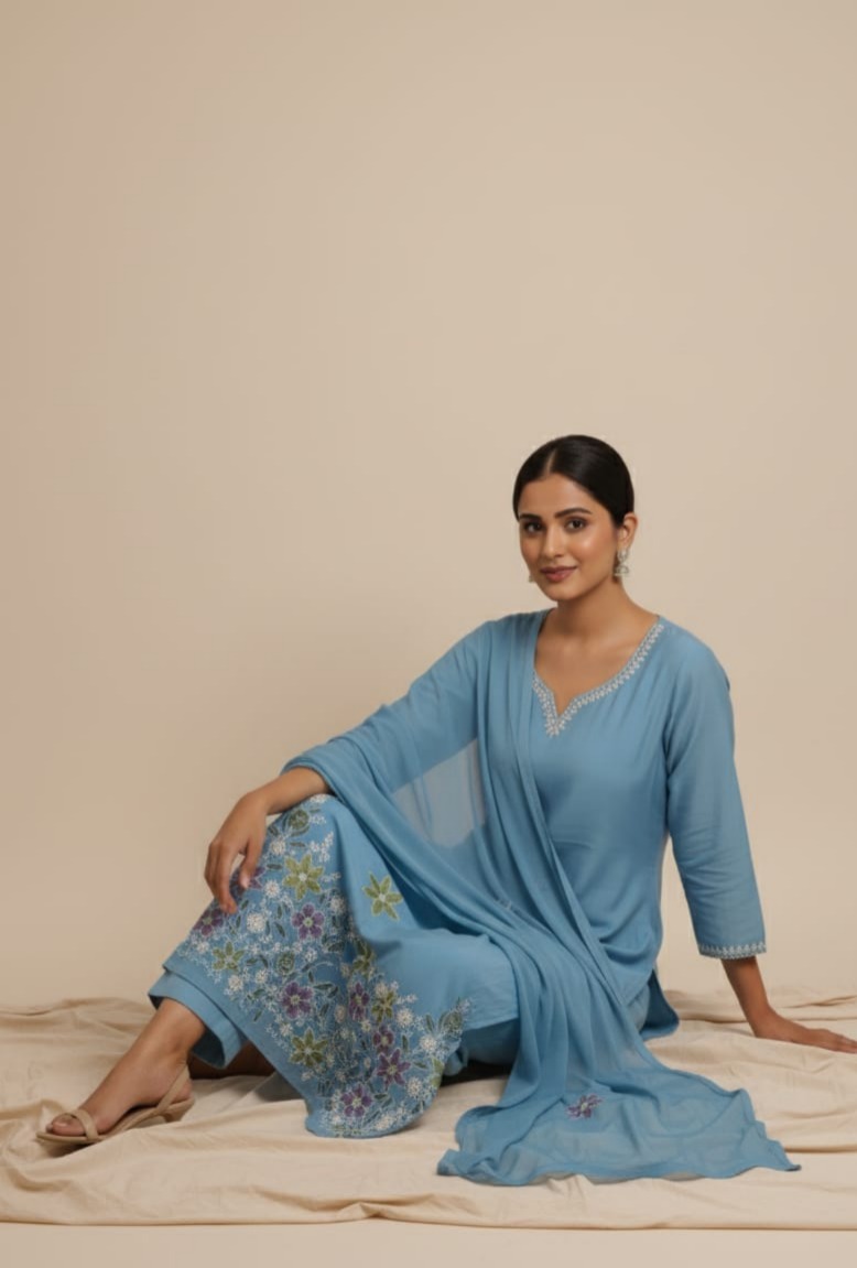 This set is styled in a serene sky-blue hue, giving it a soft, ethereal appearance. The fabric is premium Mul Chanderi—a lightweight, semi-transparent weave known for its graceful drape and subtle sheen.