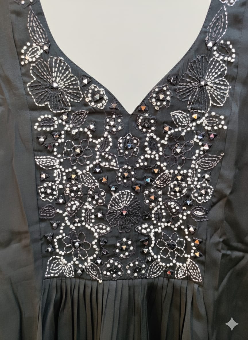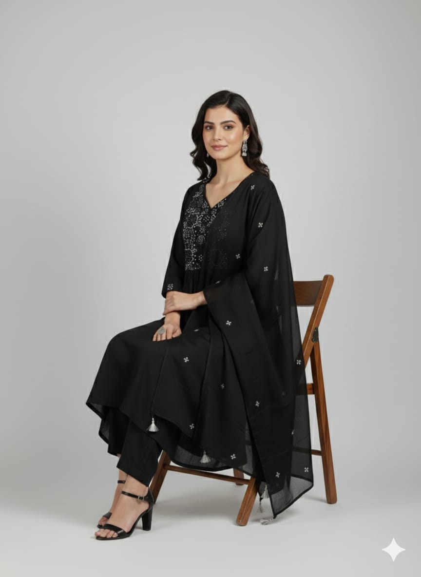 Make a bold statement with this Black Semi Silk Three Piece Set, intricately designed with thread, real mirror, and sequence work. The semi-silk fabric adds a rich texture and subtle sheen, making it ideal for festive or evening occasions. Paired with a matching dupatta and bottom, this ensemble reflects timeless elegance with a modern touch.