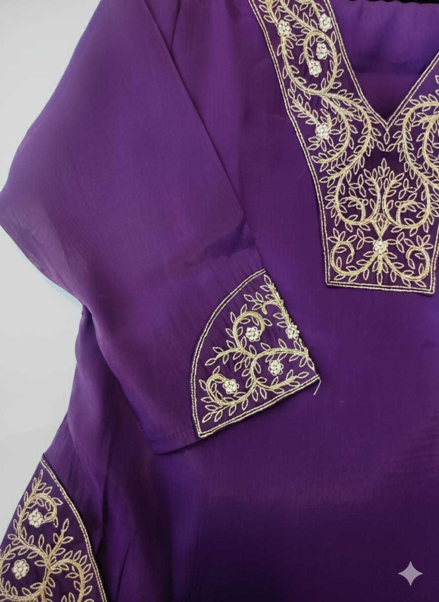 Ready to wear festive three piece set. Worked with zari , piping and beads. Perfect for any kind of occasions.